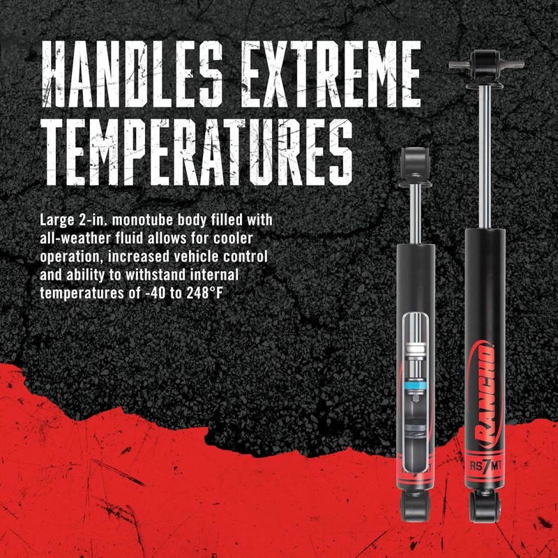- Handles Extreme Temperature Changes: Large 2-in. monotube body filled with all-weather fluid allows for cooler operation, increased vehicle control and ability to withstand internal temperatures of -40 to 248°F