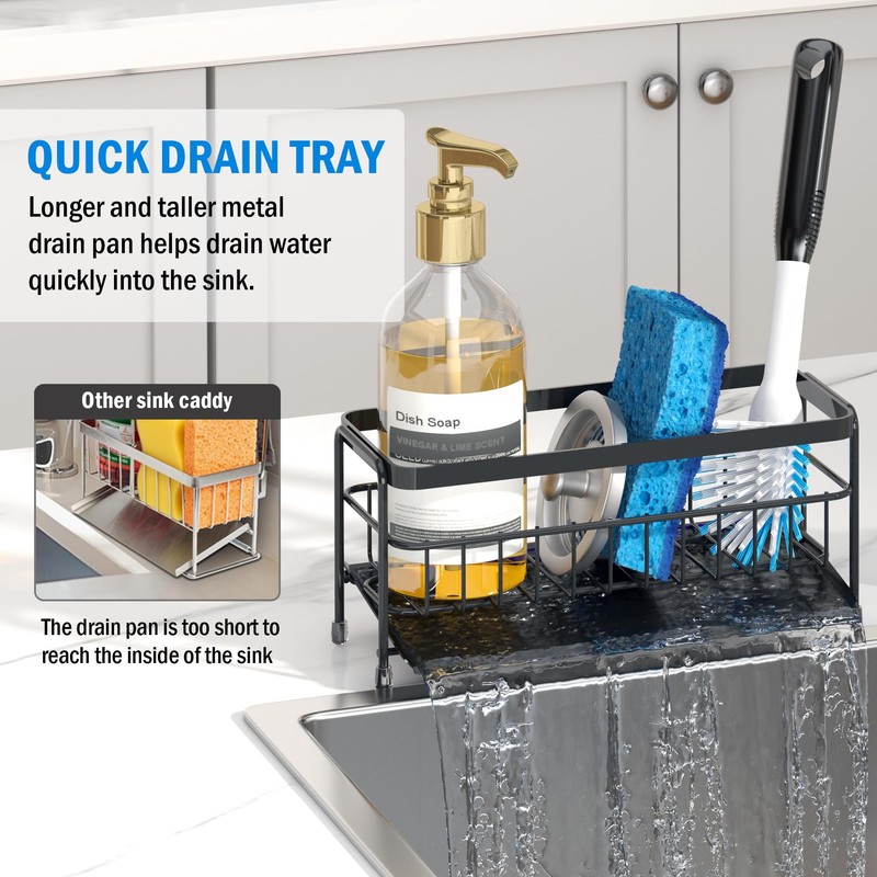 - ✅ Automatic Drainage & Quick Drying: The sponge holder features a sloped design that achieves perfect automatic drainage without manual intervention, effectively reducing kitchen workload. The hollow design rapidly drains water from the sink caddy and items, ensuring quick drying and eliminating concerns about water stains.