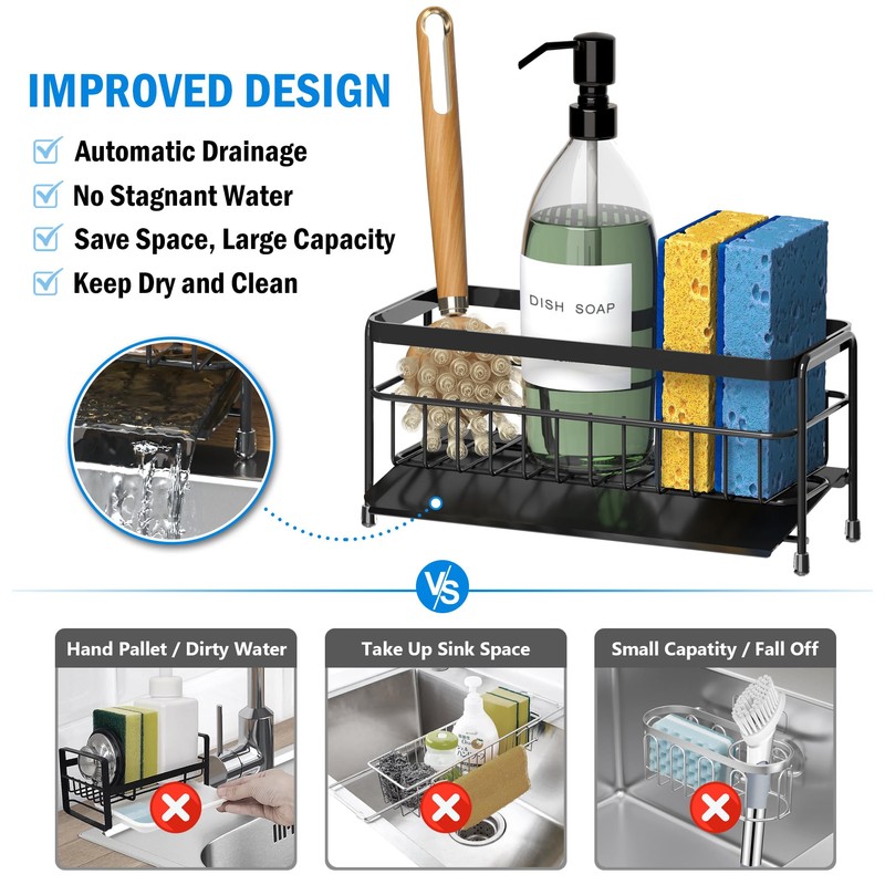 - ✅ Perfect Size: Our sponge holder is designed for kitchens with limited space, such as narrow counter areas behind the sink. With compact dimensions of 8.27×3.54×4.13 in, it effortlessly holds daily cleaning essentials like a detergent bottle, sponge, sink stopper, and dish brush, with the Trendy sink organizer you can perfectly save countertop space.