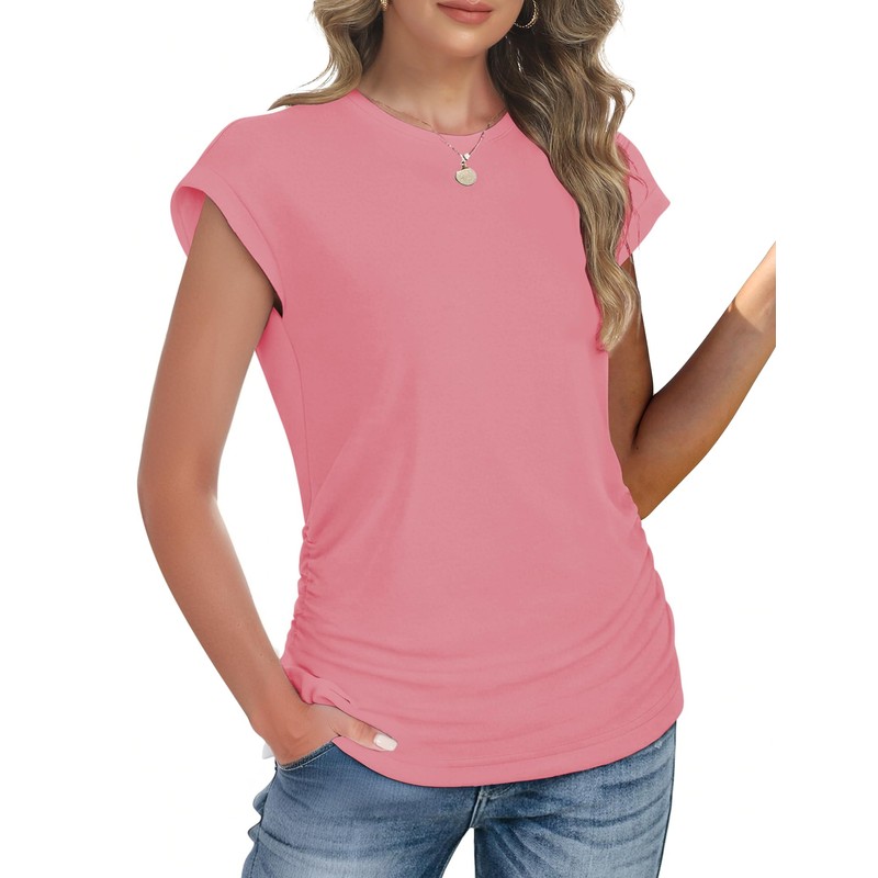 - Flattering Ruched Design: Feminine side shirring subtly conceals the midsection while accentuating curves. The classic crewneck offers comfortable movement, and tailored cap sleeves elevate this tee from casual to chic—perfect for looking polished without sacrificing comfort.