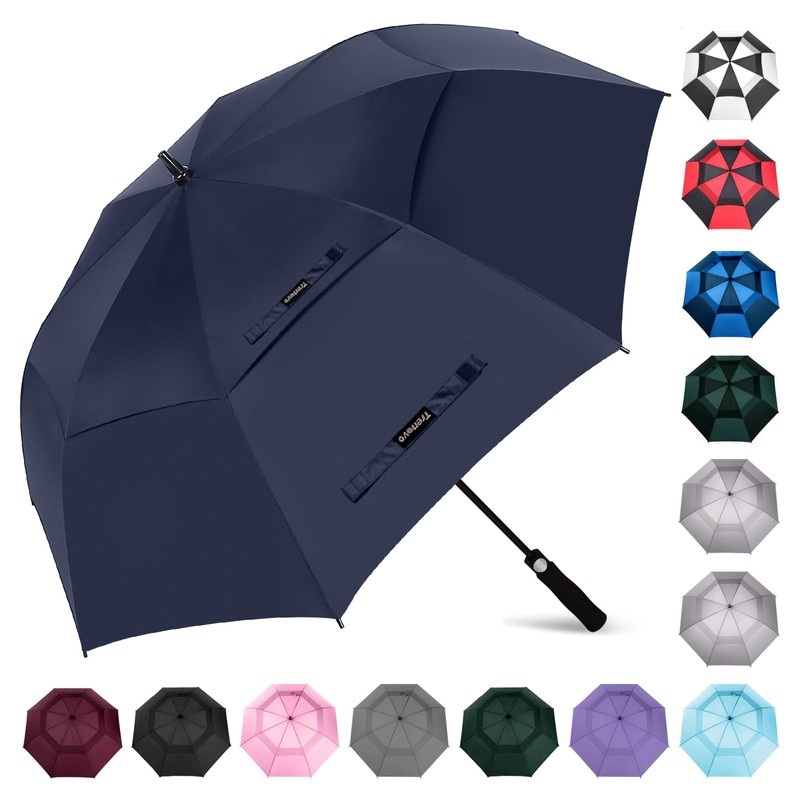 - SUPERIOR WINDPROOF: The double layer windproof design creates a vent during where wind can pass through, which can effectively reduces the resistance of the big umbrella and prevents the windproof umbrella from being blown over by strong wind. Trenovo golf umbrella has 8 reinforced fiberglass ribs and strong fiberglass shaft, sturdy but lightweight.