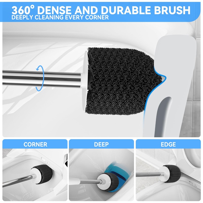 - EFFICIENT CLEANING BRUSH: The toilet brush holder set comes with traditional dense bristles that can efficiently clean the old stubborn stains, and it can also clean the dead corners of the toilet edge effortlessly, protect your toilet bowl from scratching and keep your toilet bowl clean.