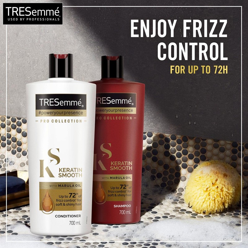 - TRESemmé Keratin Smooth hair conditioner helps to control frizzy hair without leaving hair looking dull