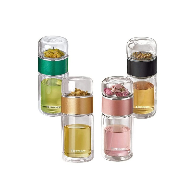 - Botella de vidrio de doble pared con infusor para té de acero inoxidable.