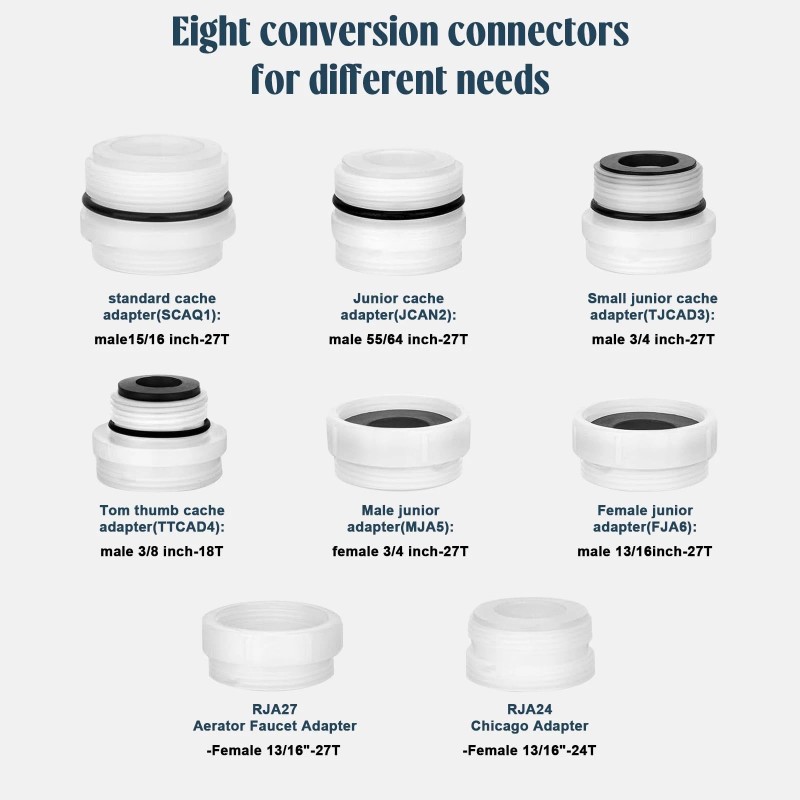 Multi-Interface Converter:standard cache adapter(SCAQ1):male15/16 inch-27T,Junior cache adapter(JCAN2):male 55/64 inch-27T,Small junior cache adapter(TJCAD3):male 3/4 inch-27T,Tom thumb cache adapter(TTCAD4):male 3/8 inch-18T,Male junior adapter(MJA5):female 3/4inch-27T,Female junior adapter(FJA6):male 13/16inch-27T,RJA27 Aerator Faucet Adapter-Female 13/16"-27T,RJA27 Aerator Faucet Adapter-Female 13/16"-27T