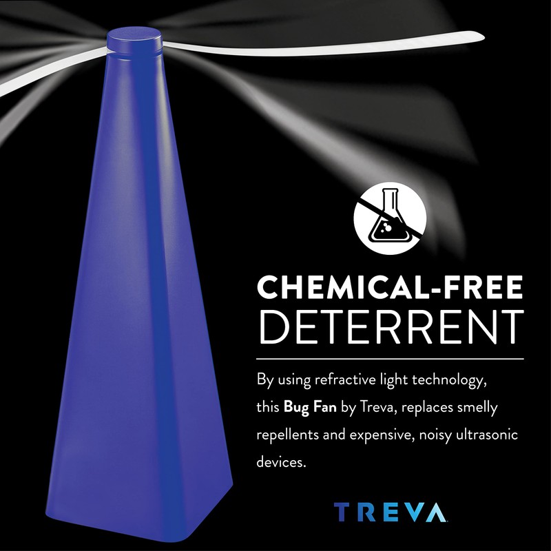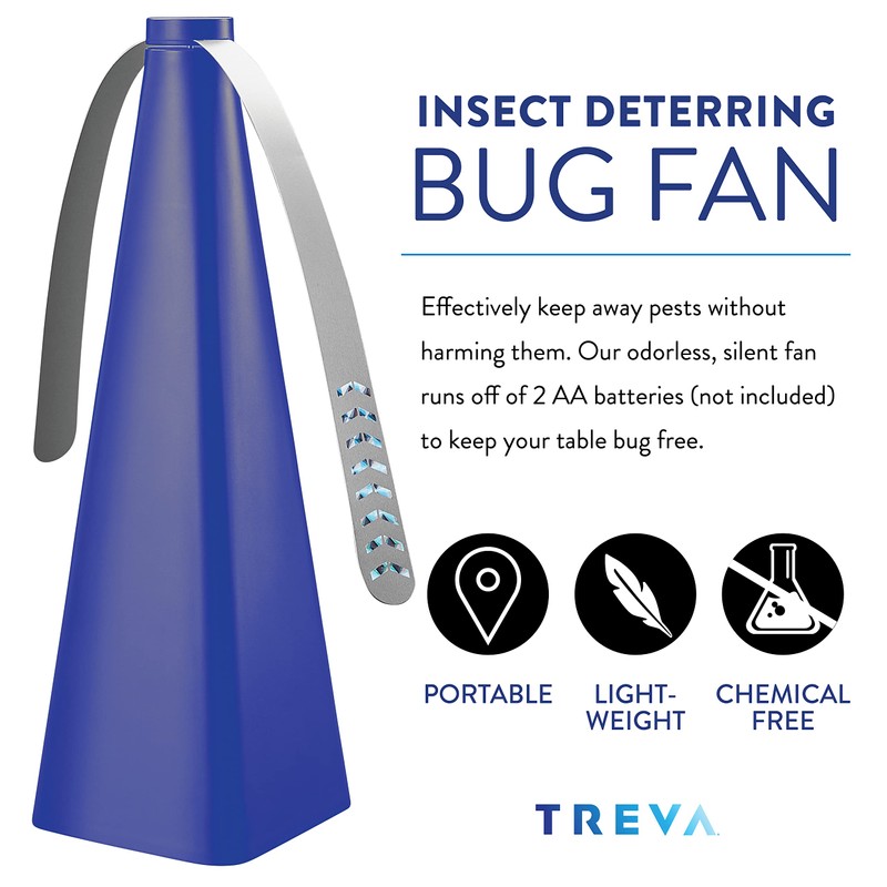 - BANISH BUGS FROM YOUR AIRSPACE - With the Treva bug deterrent fan, forget the citronella soap mosquito zapper and fly swatter. Bugs won't fly near this fan, giving you peace indoors and out