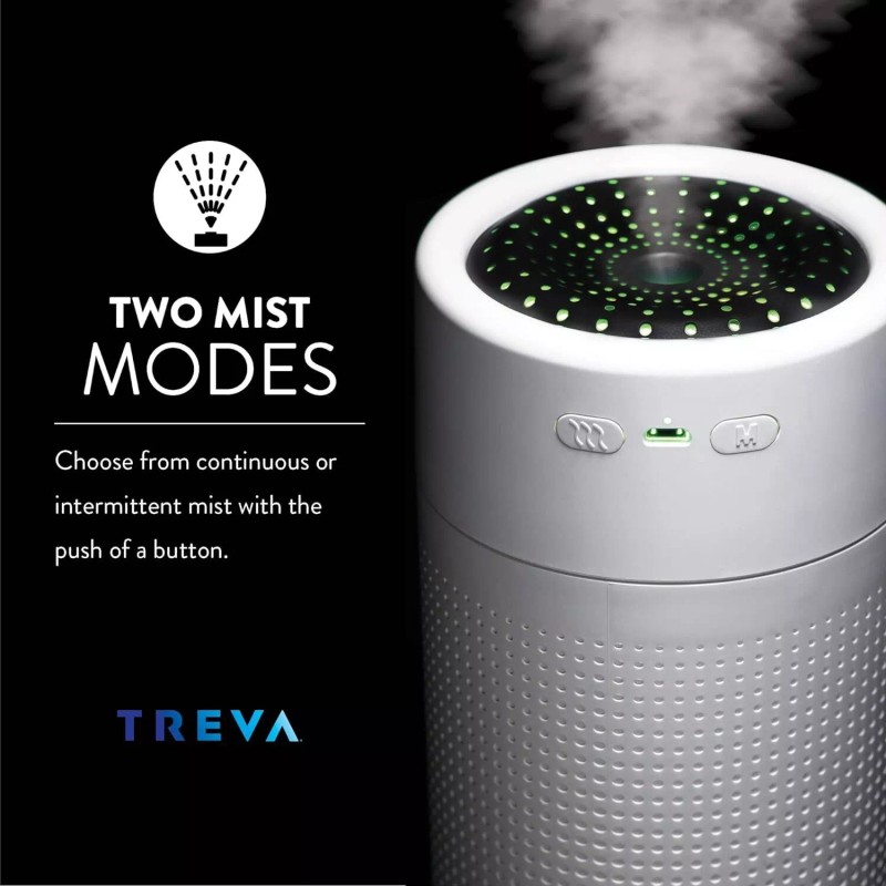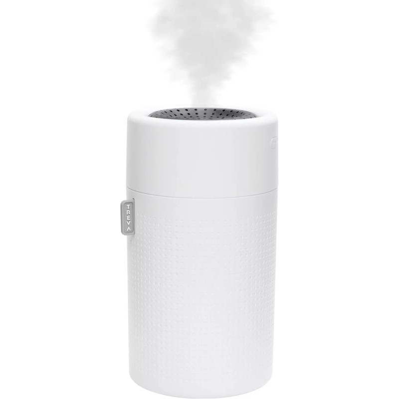 The TREVA Rechargeable Humidifier is perfect for small spaces like bedrooms, hotel rooms, dorm rooms and office space. Two mist modes: constant or intermittent. 750mL water reservoir capacity runs up to 7 hours on intermittent mode. Powered by a rechargeable battery -no need for outlets or cords! This humidifier can go anywhere! Built-in water sensor automatically turns off power when water falls below adequate supply. Leak-proof design. Optional light show can rotate through all 7 colors or press the button to hold on your favorite color.