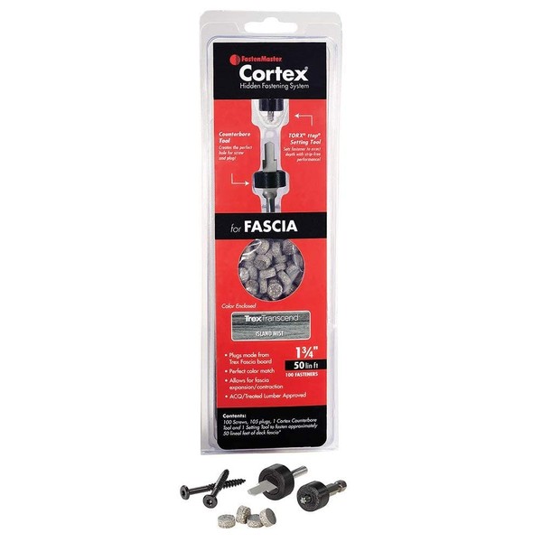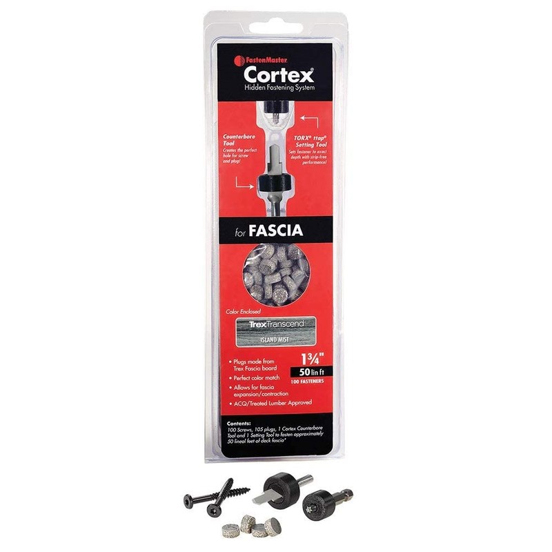 The cortex fascia hidden fastening system is the strongest, easiest way to hide fasteners in Trex Fascia Boards. It is specifically designed for trex fascia and riser boards. This is a 50 LF kit that includes 100 screws, 105 plugs, 1 counterbore tool and 1 setting tool.
