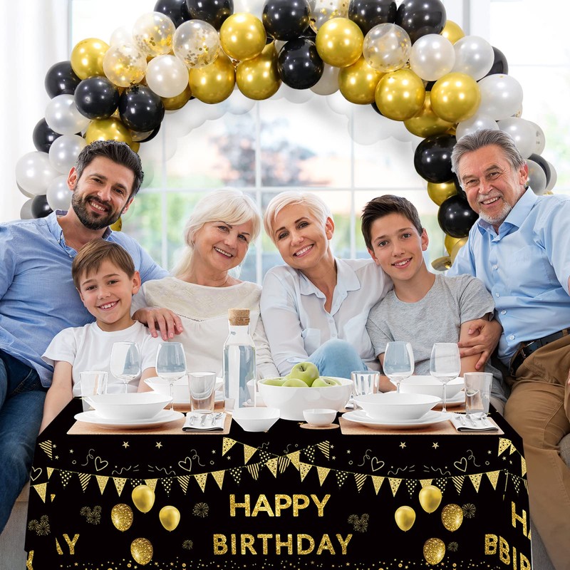 - 【What You Get】The 90th birthday party balloon set contains - 1pc black and gold 90th birthday backdrop banner (70.8 x 43.3 inches), 2pcs rectangular tablecloth with "Happy Birthday" (54 x 108 inches), 60 pcs 12 inch balloons (black * 16, gold * 16, white * 14, golden confetti* 14)