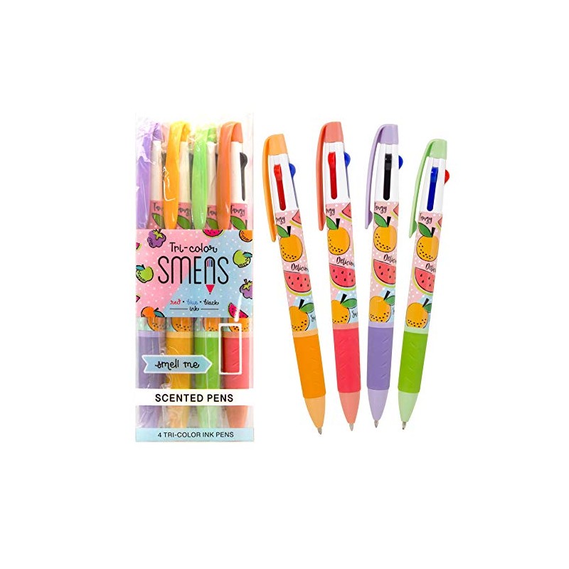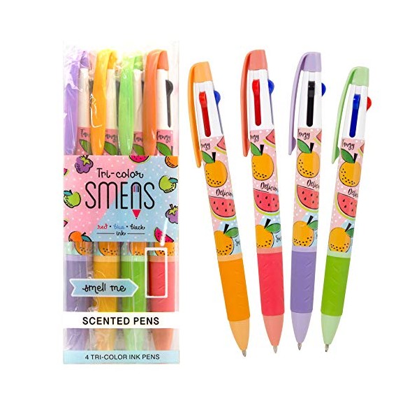 • The Tri-Color Smens 4-Pack includes 4 of our scented clickable pens each one with red, blue, and black ink