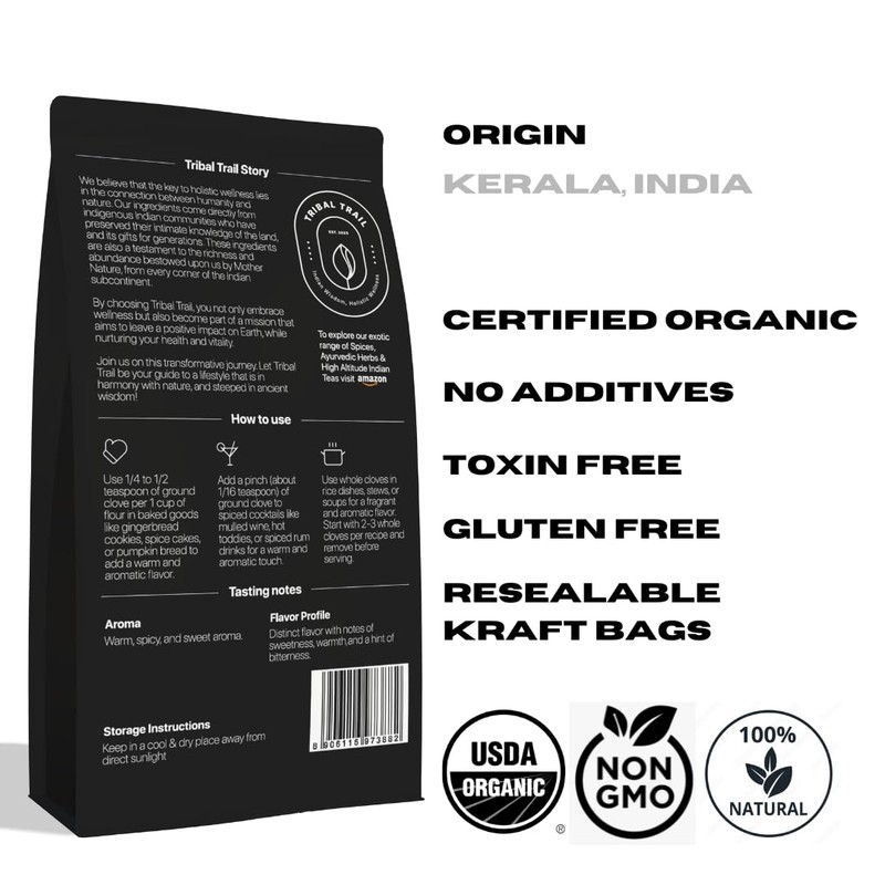 Tribal Trail Organic Cloves Whole | 4.02 oz | USDA Organic & Non-GMO | Ethically Sourced Spices from South India | Recyclable Kraft Bags | Best for Cooking, Cocktails, Smoothies & Baked goods