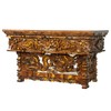 - Ornately carved from 100% natural wood, this exquisite altar table depicts lavish twin dragons with majestic garuda on each of the side panels. Dragon, considered an ancient symbol for high spirituality, wisdom, strength, and divine powers of transformation, and the mighty Garuda, the king of brids, serve as ideal protectors and embolden us in our path of spiritual transformation. Lavish motifs that display supreme craftsmanship surround this hand carved altar table. A coat of gold stain is applied to the finish to create the brushed gold finish. The table can easily be folded up for compact storage