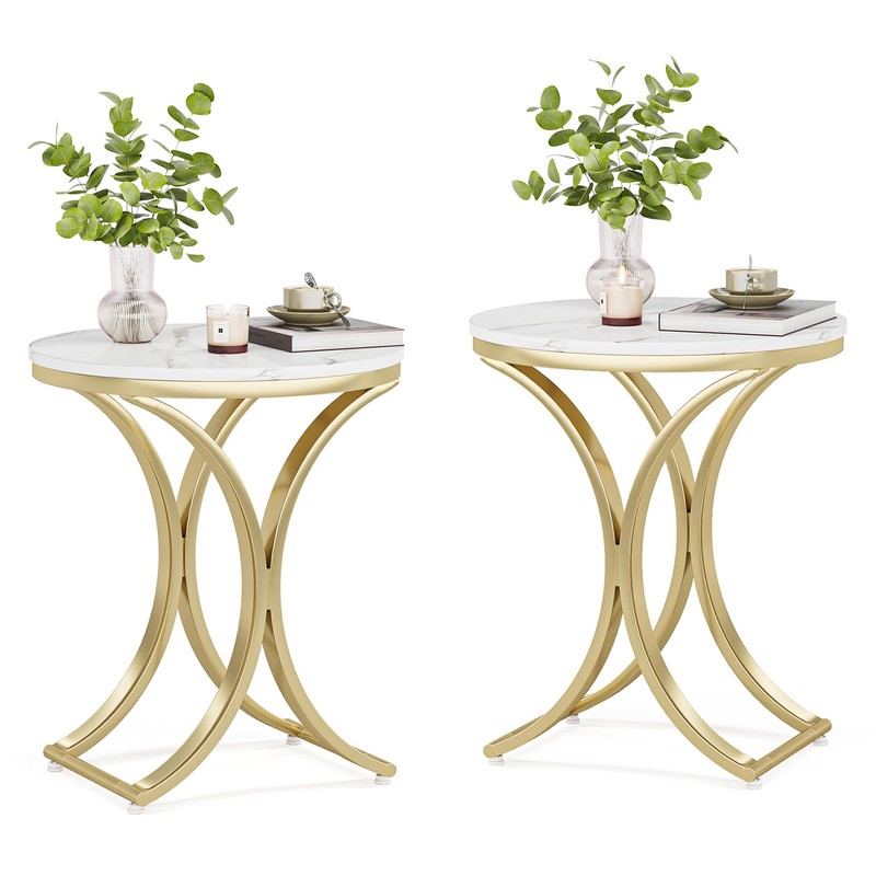 - Stylish Gold Aesthetic: The Tribesigns Round Sofa Side Table Set consists of two pieces constructed with a Gold Metal Frame and Faux Marble Veneer over Engineered Wood, exuding sophistication and durability.