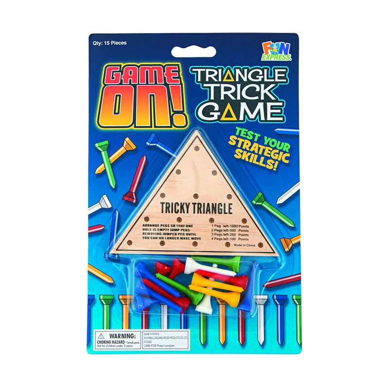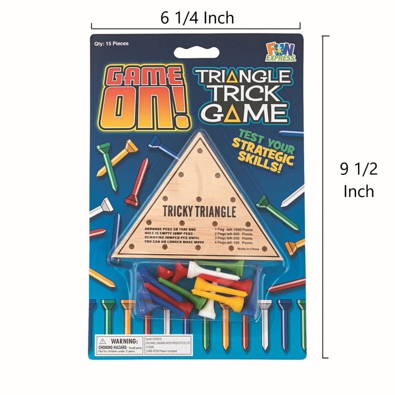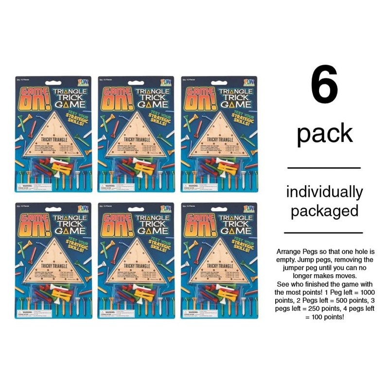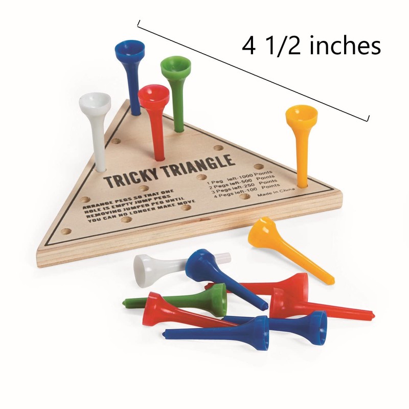 - Each triangle is individually packaged in colorful packaging and has the classic look of plain wood with directions printed on each triangle. “Arrange Pegs so that one hole is empty. Jump pegs, removing the jumper peg until you can no longer makes moves.” See who finished the game with the most points! 1 Peg left = 1000 points, 2 Pegs left = 500 points, 3 pegs left = 250 points, 4 pegs left = 100 points! Who will end up with the most points? Hours of fun!