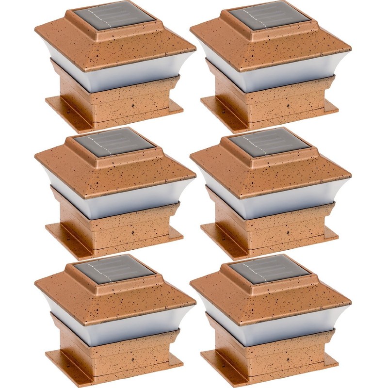 Plastic Copper Square Post Deck Fence has the following features: Sun Powered No Wiring On/Off switch Ultra Bright LED Powered by the sun Fast and easy install Rechargeable Ni-Cd AA battery included Energy, electrical saving Ideal for areas where conventional electrical supply is not available One High output long lasting ultra-bright white LED bulb More expensive ultra-highly sensitive solar panel usually seen on calculators is used Automatic dusk-to- dawn operation, On/off manual over-ride switch Recharged by solar panel under sunlight Light turns on automatically when dark Safe Water Resistant Corrosion resistant CE certified - User controllable on / off switch - CE Certified for ultimate safety - Upper Base Dimensions : 4-Inch (l) x 4-Inch (w) - Lower Base Dimensions : 4-Inch (l) x 5.5-Inch (w) - WILL FIT 4-Inch x 4-Inch POSTS Solar Light Dimensions : 5.5-Inch (l) x 5.5-Inch (w) x 4.5-Inch (h) Post Size Fitting - Wood or Composite Posts : must be smaller than 3-13/16-Inch square - Hollow Vinyl Posts : inside opening must be larger than 3-15/16-Inch square.