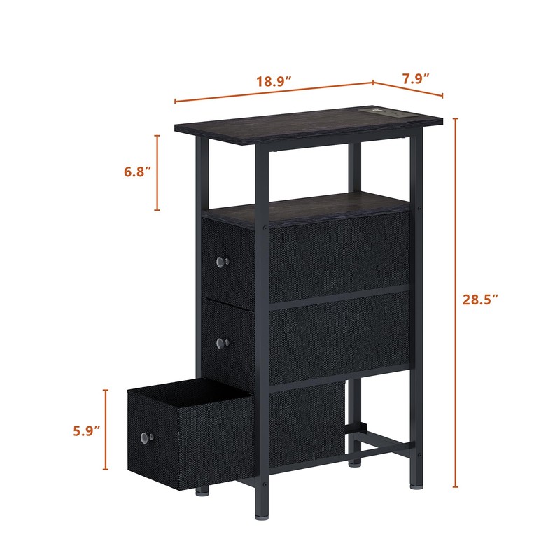 TRIFEBLE End Table with Charging Station, Narrow Side Table with 3 Fabric Drawers, Skinny Nightstand with LED Light, Slim Bedside Table for Bedroom, Living Room, Small Spaces, Black