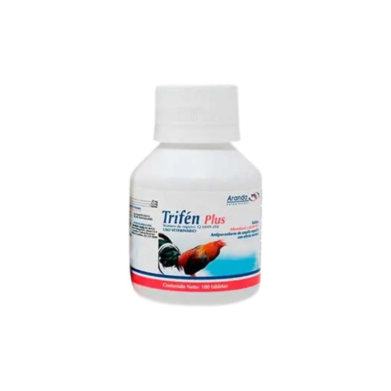 Trifén Plus 100 Tabs, el antiparasitario de amplio espectro ideal para mantener la salud de tus aves. Este potente desparasitante está formulado específicamente para combatir parásitos gastroentéricos y pulmonares, garantizando el bienestar de tus gallos de ornato y otras aves.