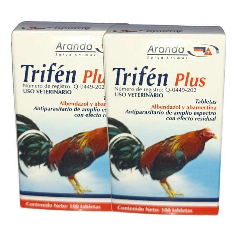 El Kit Trifén Plus de 2 frascos es la solución ideal para el tratamiento y control de parásitos internos en gallos, gallinas, pollos, aves de exhibición, faisanes y más. Su fórmula de Albendazol + Abamectina proporciona un efecto antiparasitario potente y prolongado, protegiendo la salud y el rendimiento de tus aves.