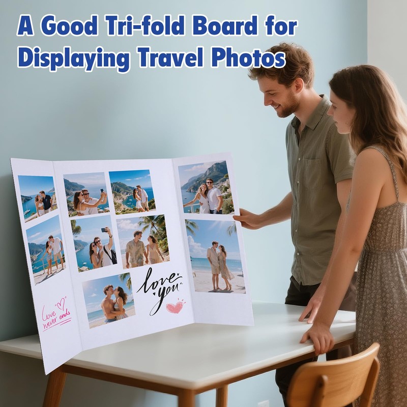 • 【Sturdy Trifold Display Board】:Our trifold display board features a self-supporting design with two side panels that provide reliable stability on flat surfaces. The smart three-panel structure allows the board to stand firmly on tables or desks without extra supports, ensuring a seamless display experience for both presenters and viewers.
