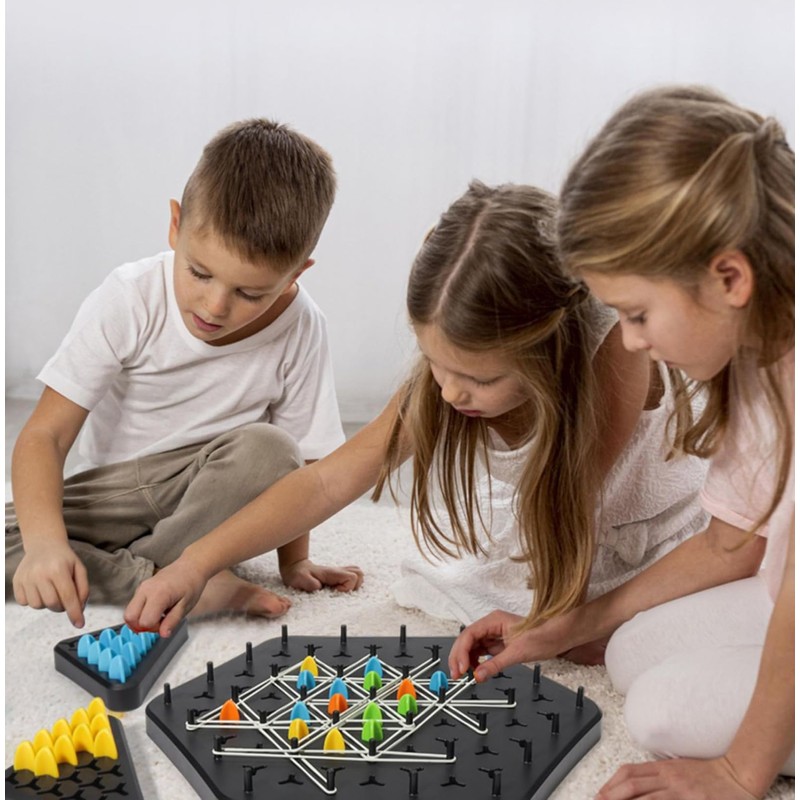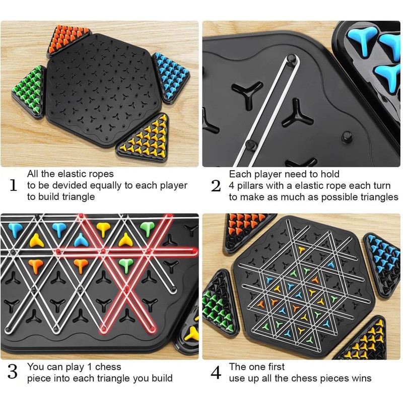 - Playing style: all elastic ropes that are evenly distributed to each player to build a triangle. Each player must hold four pillars with an elastic rope to make as much triangles as possible. You can play a chess piece into any triangle you build. Whoever consumes all chess pieces first wins