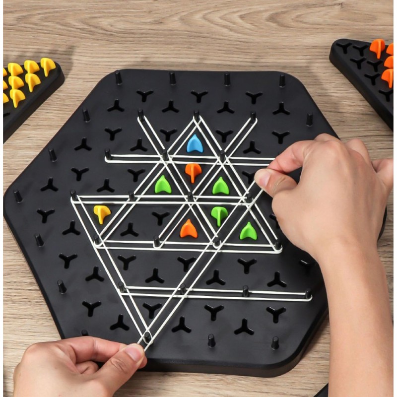 - Triangle tabletop tactical game: board game set includes 1 triangular board, 4 small chess board, 84 tiles in 4 colours, 1 manual (English language not guaranteed), 48 rubber bands and a colourful box packaging. With this trigger game, the imagination is stimulated and problem solving skills are trained