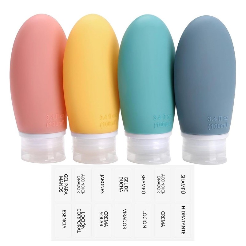 - BOTELLAS DE VIAJE PORTÁTILES: Nuestras botellas de viaje tienen una abertura ancha para rellenarlas y limpiarlas fácilmente. Esencial para viajes, con 4 colores diferentes de botellas y etiquetas, puedes identificar fácilmente los diferentes contenidos. Perfecto para champú, lociones, jabón líquido, protector solar, gel y cremas.