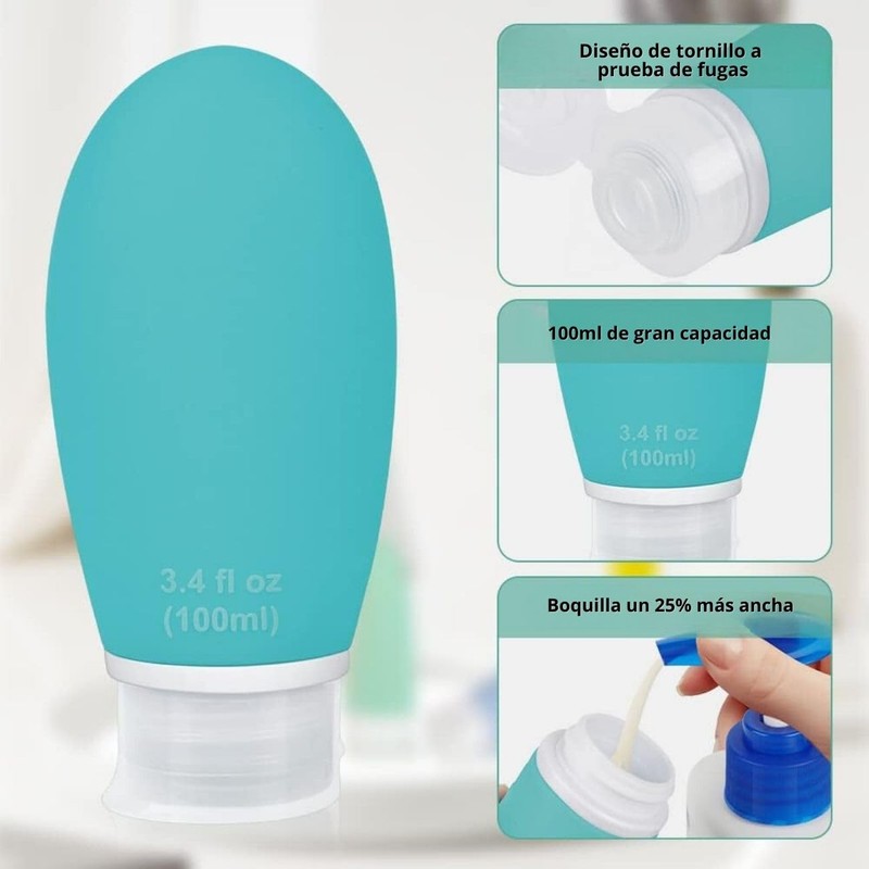 - A PRUEBA DE FUGAS: Con un diseño mejorado antifugas, estas botellas de viaje solo dispensarán el contenido de la botella cuando se presione su cuerpo de silicona. Nunca tendrá que preocuparse por derrames o fuga de líquido en su bolsa.