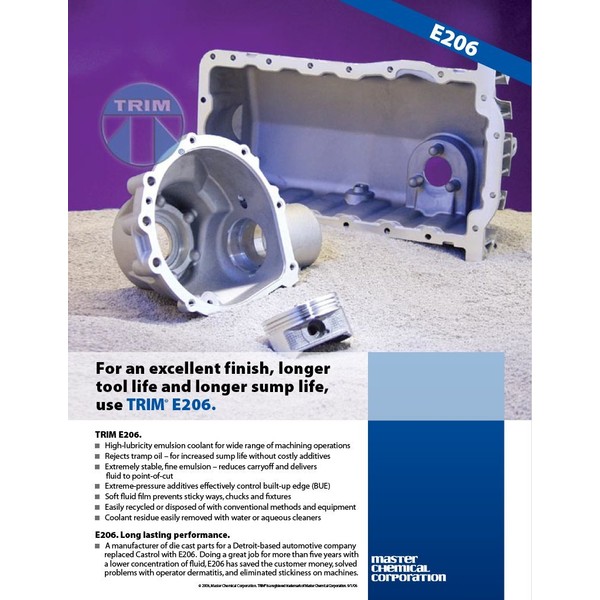 TRIM E206 is a soluble oil (emulsion) coolant that performs extremely well in a wide range of machining operations on ferrous and nonferrous materials. It has the lubricity and ?guts? necessary to do heavy-duty machining center work and still provide the wetting and cooling necessary to do high-speed turning and grinding operations.