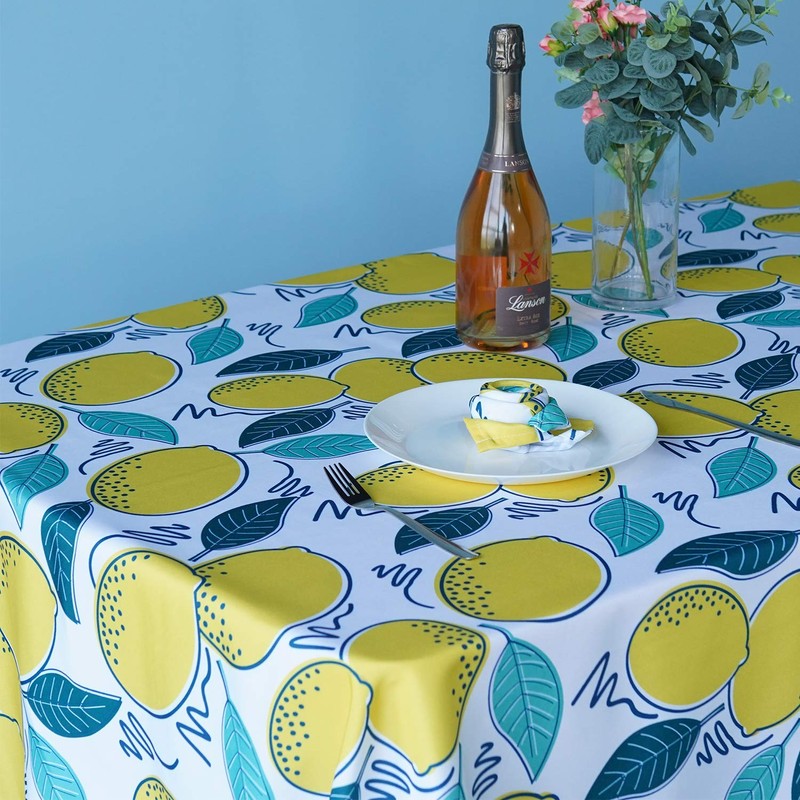 - đăPRINTED TABLECLOTHă: Add summer flair to your home decor with Trimming Shop's printed rectangle tablecloth. Printed summer tablecloth is designed with yellow lemon fruits and leaves creating a perfect spring-summer scene for indoor or outdoor table decor. It will add a touch of elegance to the summer party table setting and create a pleasant atmosphere