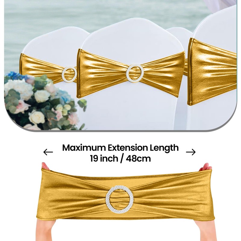 Trimming Shop Shiny Gold Spandex Chair Band with Slider Buckle, Stretchy Fabric Chair Band Sash, Elastic Wedding Chair Cover Band for Chair Decoration, Wedding Party, Reception, Banquet, 25pcs