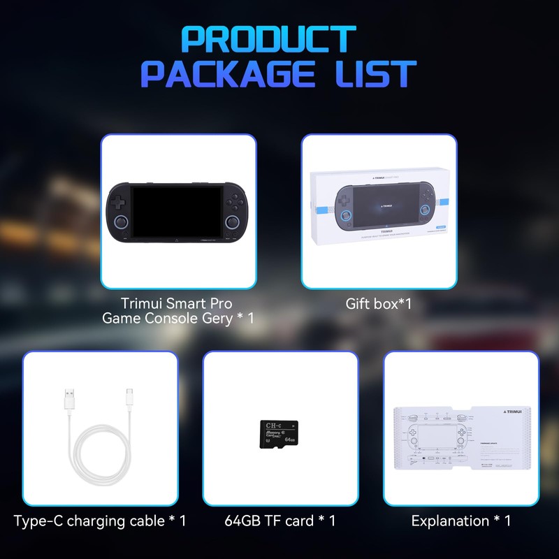 - 【Package List】1 x Trimui Smart Pro Console , 1 x USB-C Charge Cable, 1 x Insctruction.