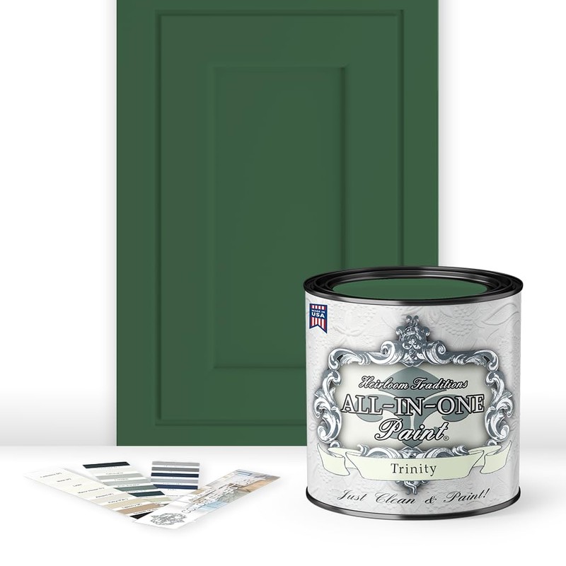 ALL-IN-ONE Paint, Durable cabinet and furniture paint. Built in primer and top coat, no sanding needed. Includes our 30 featured color card - Trinity (green), Quart