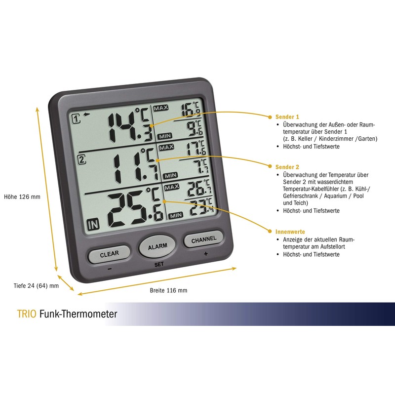 - Outdoor sensor: In total, the digital thermometer can be connected to up to 8 transmitters via radio, so you can control other rooms, such as garage, cellar, children's room or wine cellar