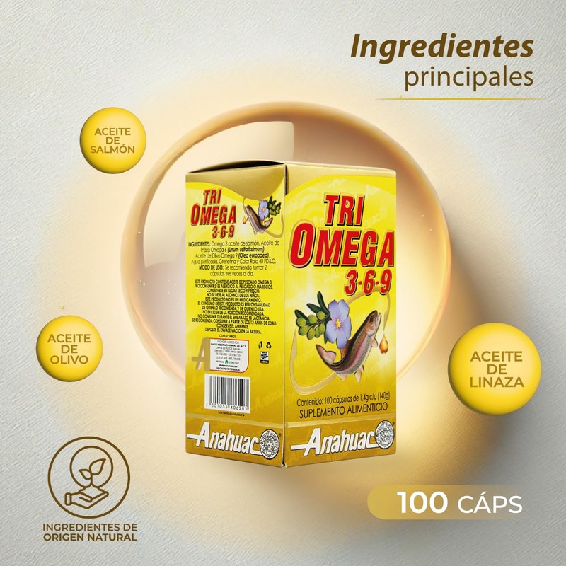 TRIOMEGA 3, 6, 9, Suplemento Alimenticio, Salud Cardiovascular, 100 capsulas, Anahuac.
