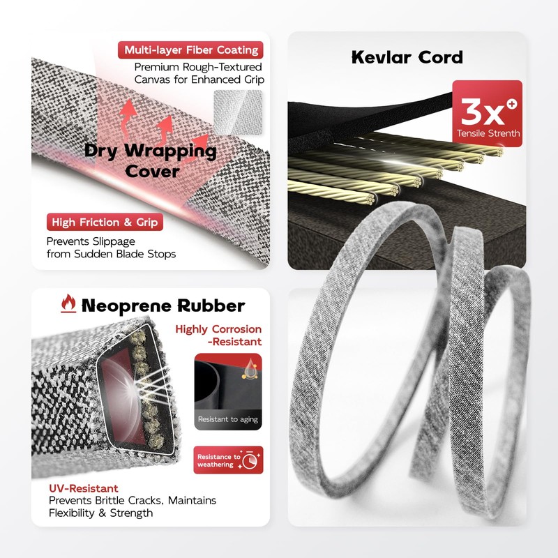 - 【NO-SLIP GRIP】The multi-layer Dry-wrapping maximizes friction, ensuring a firm grip even on wet surfaces. It instantly locks in place to prevent blade slippage, delivering steady power and shielding the motor from overload. With superior anti-slip performance over standard rubber belts, it keeps your work smooth and reliable in any condition.