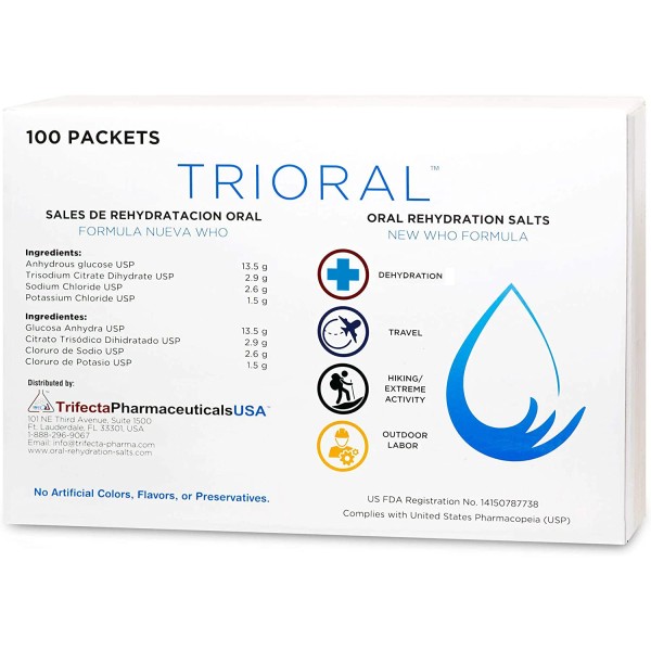 Each packet can be dissolved into one liter of drinking water to help re-hydrate your body quickly regardless of the reason.Product Uses:Dehydration may occur unexpectedly and rapidly as a result of excessive fluid loss due to sweating, urination, fever, diarrhea, vomiting, excessive physical activity and more. When the body is depleted of critical salts and water, severe dehydration many ensue, resulting in an acute medical emergency.Unlike many electrolyte solutions or other powders, this ORS does NOT contain any artificial sweeteners, flavoring agents, colors, or preservatives. TRIORAL ORS does NOT contain sucralose, aspartame, preservatives or any extra ingredients that may impact the quality and effectiveness. It is also gluten-free.