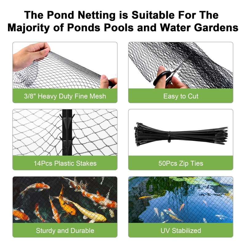 - Not Only Pond Netting, But Also Garden Netting&Pool Netting: Our pond net kit not just pond netting for koi ponds, provide the best protection like gardeners, aquascaping, water gardens, waterfall features and more. But also can be used as garden netting and pool netting, protect the plants, fruit trees, berries, vegetables, always keep pool clean and save yourself from a massive cleaning