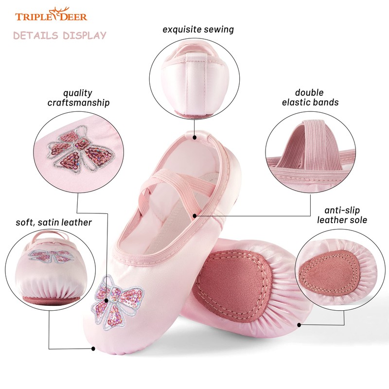 TRIPLE DEER Ballet Shoes for Girls, Satin Dance Practice Slippers Split Soft Leather Flat Sole Yoga Gymnastics Shoes Bow Sequins Pattern(Toddler/Little/Big Kid)