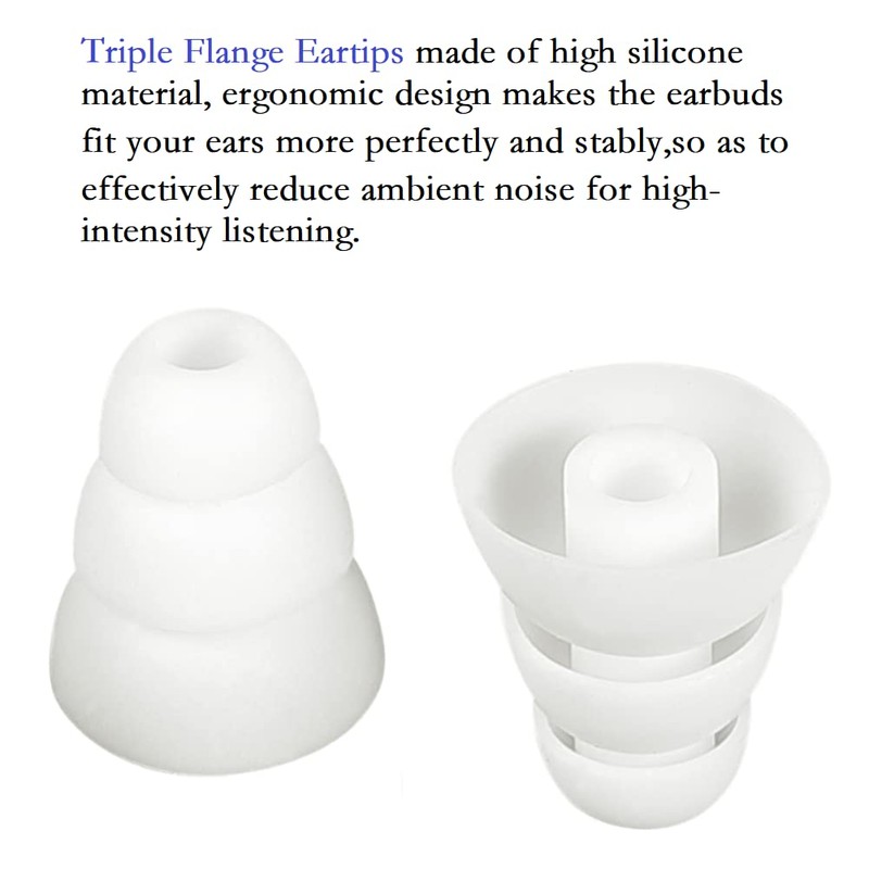 • Package Includes: 9 Pairs(S/M/L)Replacement Triple Flange Conical Ear Tips;1 Pcs Blue Cleaning Cloth;A Plastic Box for Eartips(Earbuds Only ,Earphones Not Included).