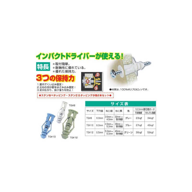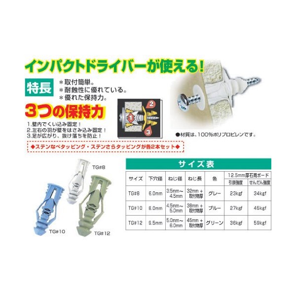 Provides outstanding holding power on walls such as drywall, blocks, concrete, plywood, ALC, etc. Works with any drywall (9.5mm, 12.5mm, 15mm thick). The photo shows TG#8
