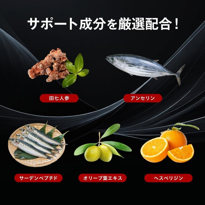 - ✅ Carefully selected supporting ingredients included! "Anserine", "Tenshichi ginseng", "Sardine peptide", "Olive extract", and "Hesperidin"