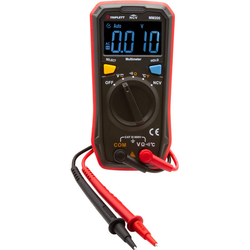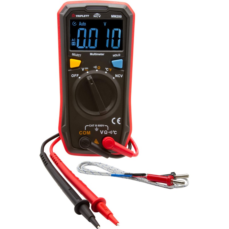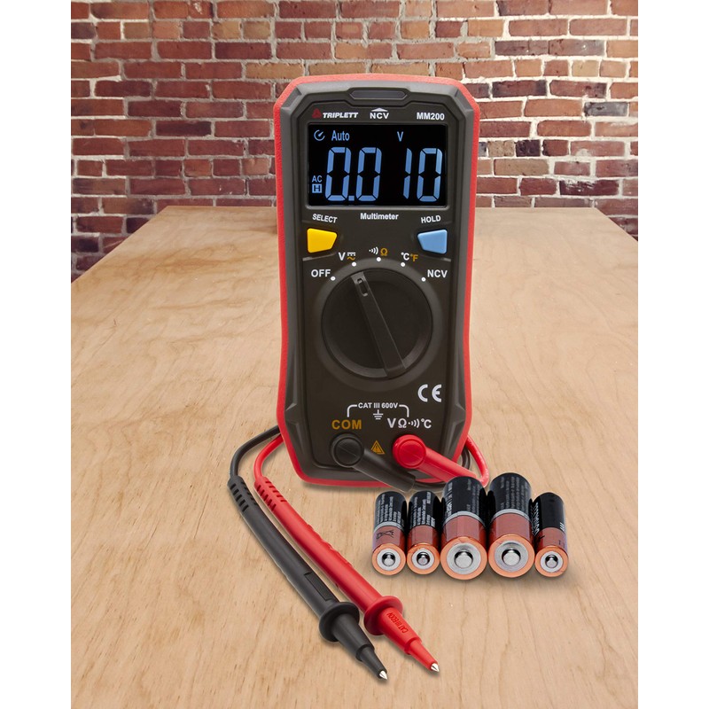 The Triplett MM200 Compact Multimeter was designed for the professional or DIYer. It measures AC/DC Voltage, Resistance, Temperature and Continuity. Diagnose common wiring problems; test batteries, solar cells, wall plugs, and power outlets; check polarity of wires in wiring installations; Measure input and output resistance of circuits (motors, transformers, resistors); check continuity of wires, and circuits. Easy to read with a 4000 count EBTN (Enhanced Black Twisted Nematic) display with a wide viewing angle and Data Hold function. The built-in non-contact voltage detector is easy to use with 3 color light indication and audible beeper. The MM200 maximizes your battery life with Auto Power Off (with disable) and a battery strength indication on power up. Comes complete and ready to use with test leads, temperature probe, and (2) AAA batteries. cETLus listed. CAT III 600V safety category.