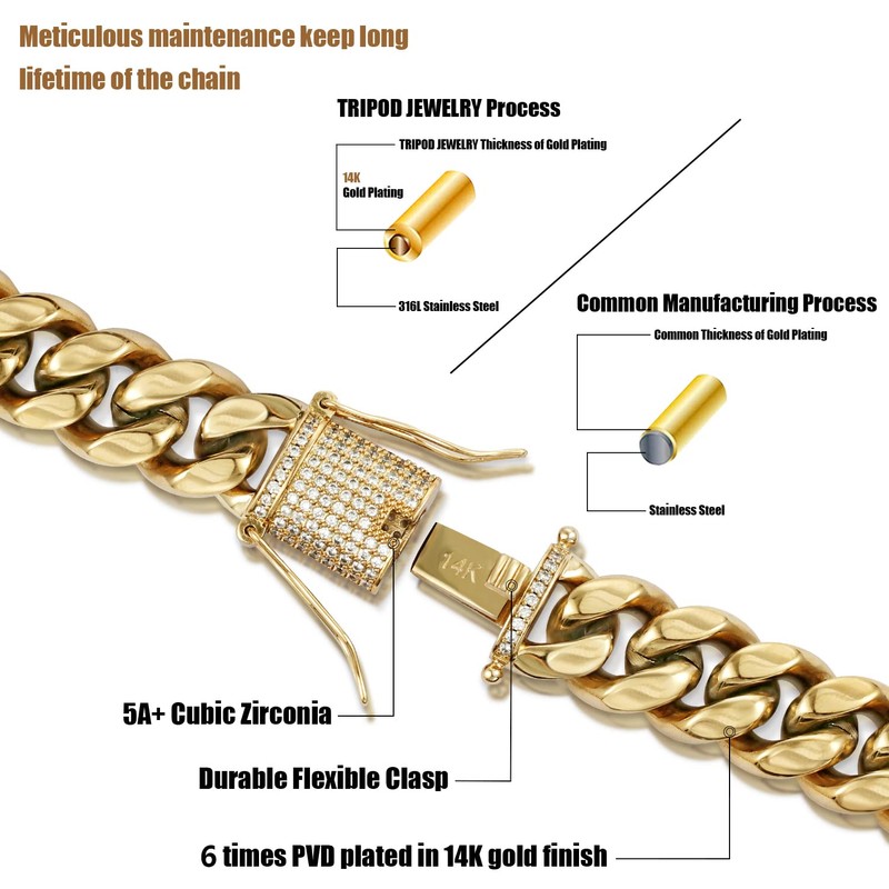- FINEST MATERIAL: Electroplated 6 times Real 14K gold over solid 316L stainless steel core, with high polished shiny surface, will never tarnish or change color, presenting you nice and heavy thick Cuban chain feels.