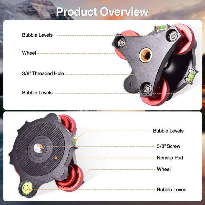 - 【High-Quality Materials】The camera leveler tripod leveling base with a three-axis tri-wheel head is primarily constructed from lightweight aircraft-grade aluminum material, processed with CNC machining, and treated with hard-anodized oxidation on the surface. This results in a smooth surface finish and ensures a long lifespan. Additionally, the top is equipped with a rubber pad to prevent slipping and enhance stability.