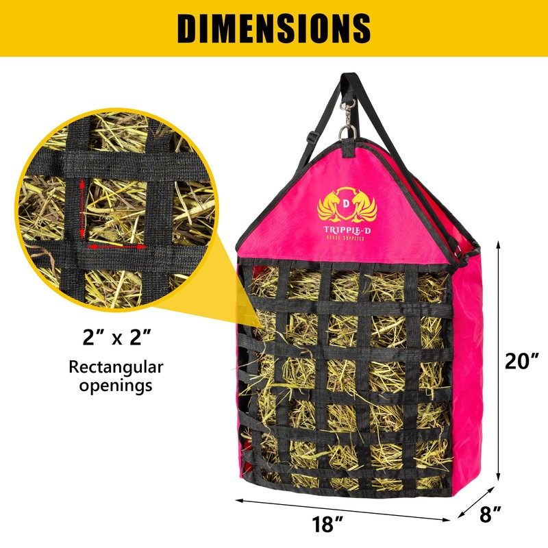 - MEASUREMENTS - with a 18"x20"x8" size , this hay bag can easily hold approx 2 hay bales, ensuring your horse has consistent access to food supplies throughout the day.with square openings measuring 2" x 2" , and velcro sealable top nets