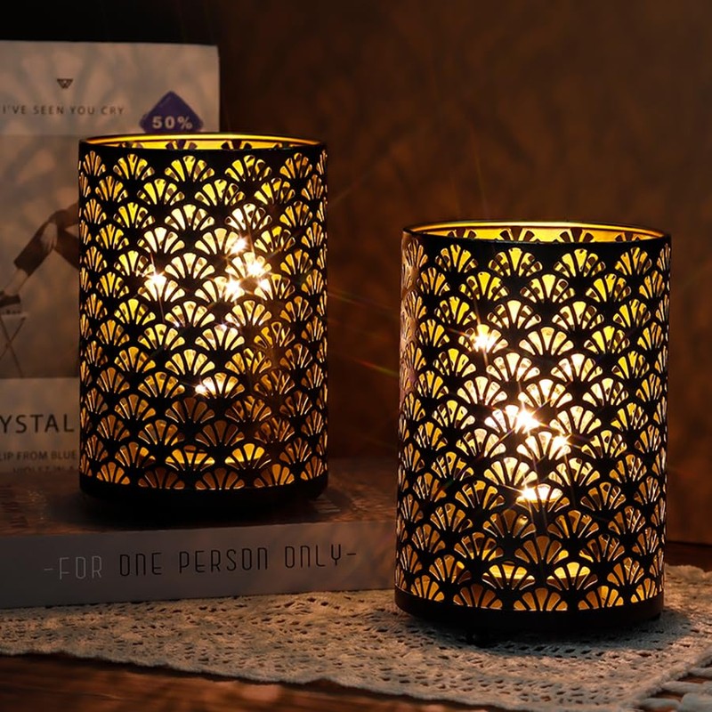 TRIROCKS Set of 2 Battery Operated Lamp 6.5'' Tall Metal Cordless Table Lamp Bronze Lanterns with Warm Fairy Lights Bulb for Patio Garden Wedding Parties Indoor Outdoor(Scalloped Hollow Pattern)