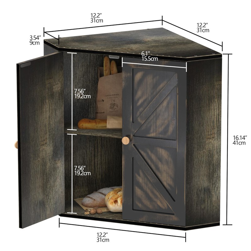 - Large Capacity:Our corner bread box with 2 layers of 16.9”L x 11.2”W x 16.5”H board are large enough to hold 2 large loaves of bread, rolls, muffins, and more. Flat top design,any kitchen items you want can be placed on the bread box. It can save your space and meet the needs of your family.