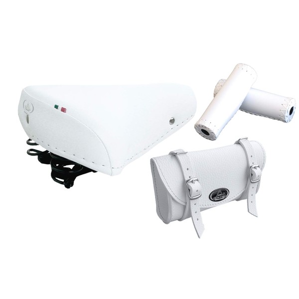 Tris Montegrappa (White): Vintage Saddle 07/F + handles + bag mod. 0016 original vintage saddle Montegrappa. Model: 07/F handmade 100% made in Italy. High quality. Genuine Selle Monte Grappa Product Saddle with two strong springs for shock absorption. Ideal for vintage cars, travel wheels, thank you. Unisex wear-resistant, smooth and scratch-resistant surface. Ideal for anyone looking for a comfortable saddle. High density anti-shock foam/gel interior. Dimensions: 26.5 x 21.5 cm. Weight: 830g Montegrappa leather saddle bag. Handmade in Italy. High quality Classic style. The bag is attached to the saddle with two straps and then fastened with two buckles. Dimensions: 16 x 8 x 4 cm. Pair of Montegrappa leather handles. Made in Italy. Craft length: 11.8 cm. Diameter: 3.5 cm. Saddle colour: white. Bag colour: white. Knob colour: white