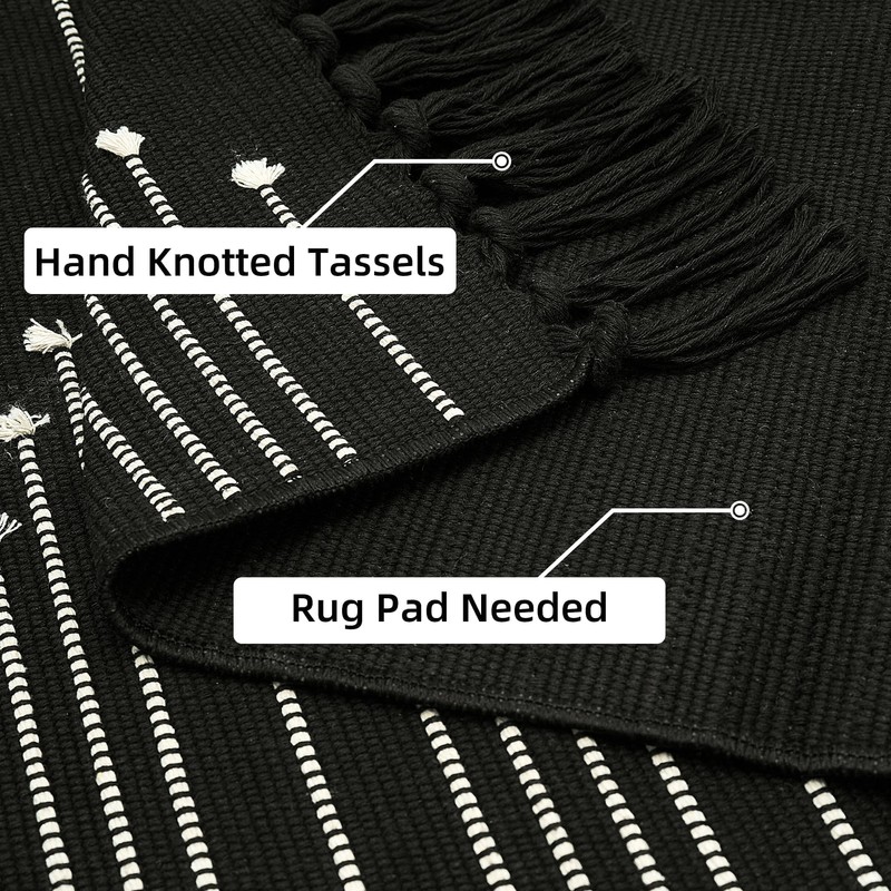 • 🧶Hand Woven Cotton Rugs with Tassels: Elevate your space with this black and white woven cotton rug, featuring knotted tassels that exude Moroccan flair. The intricate tassels add a stylish touch, transforming any room into a beautifully decorated haven with distinctive elegance.