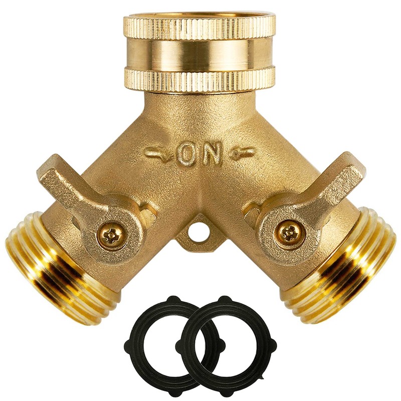 - Appearance: 2 way Y shape brass hose splitter with 3 connectors and 2 valve.